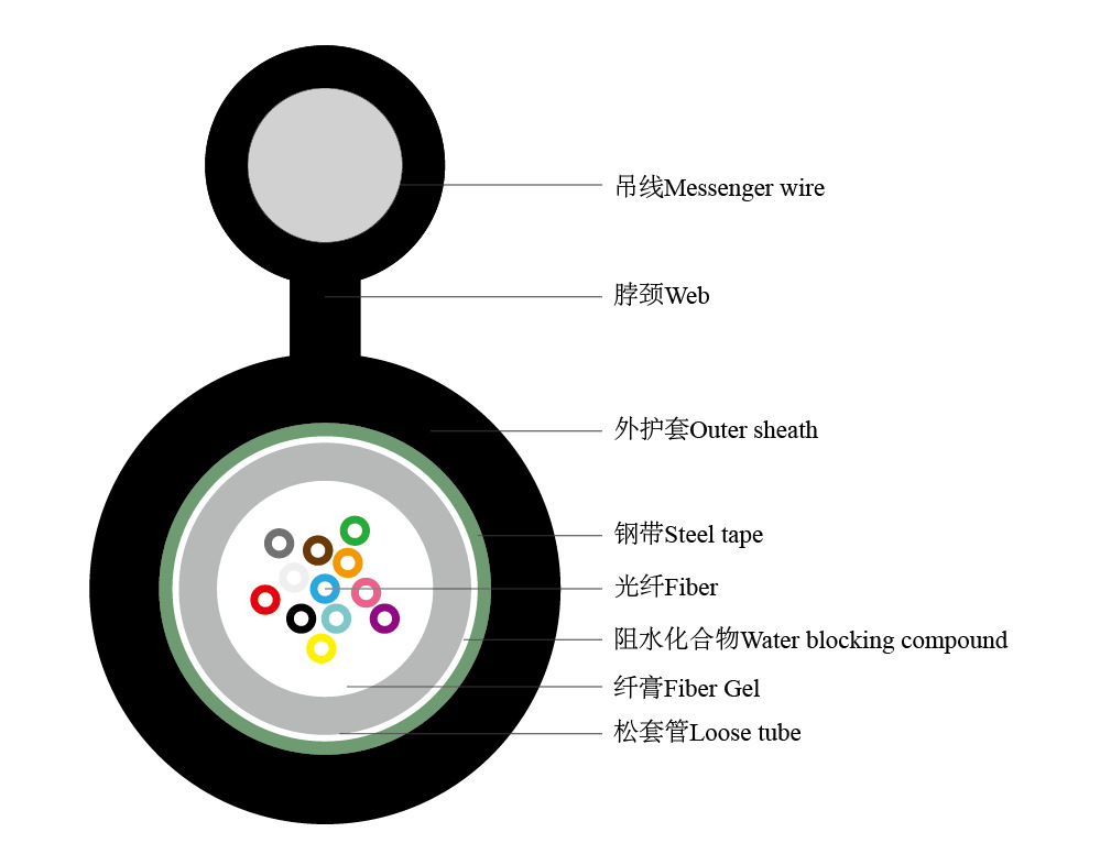 โครงสร้างของมันประกอบด้วย ท่อหลวมตรงกลางที่บรรจุเจล, เกราะเทปเหล็กแบบลูกฟูก, และ สายส่งสารแยก—ไม่ว่าจะเป็น เกลียวเหล็กชุบสังกะสี หรือ ลวดเหล็กเดี่ยว—สร้างโปรไฟล์รูปเลข 8 ที่แข็งแรงและเชื่อถือได้ เหมาะสำหรับการวางเสาต่อเสา